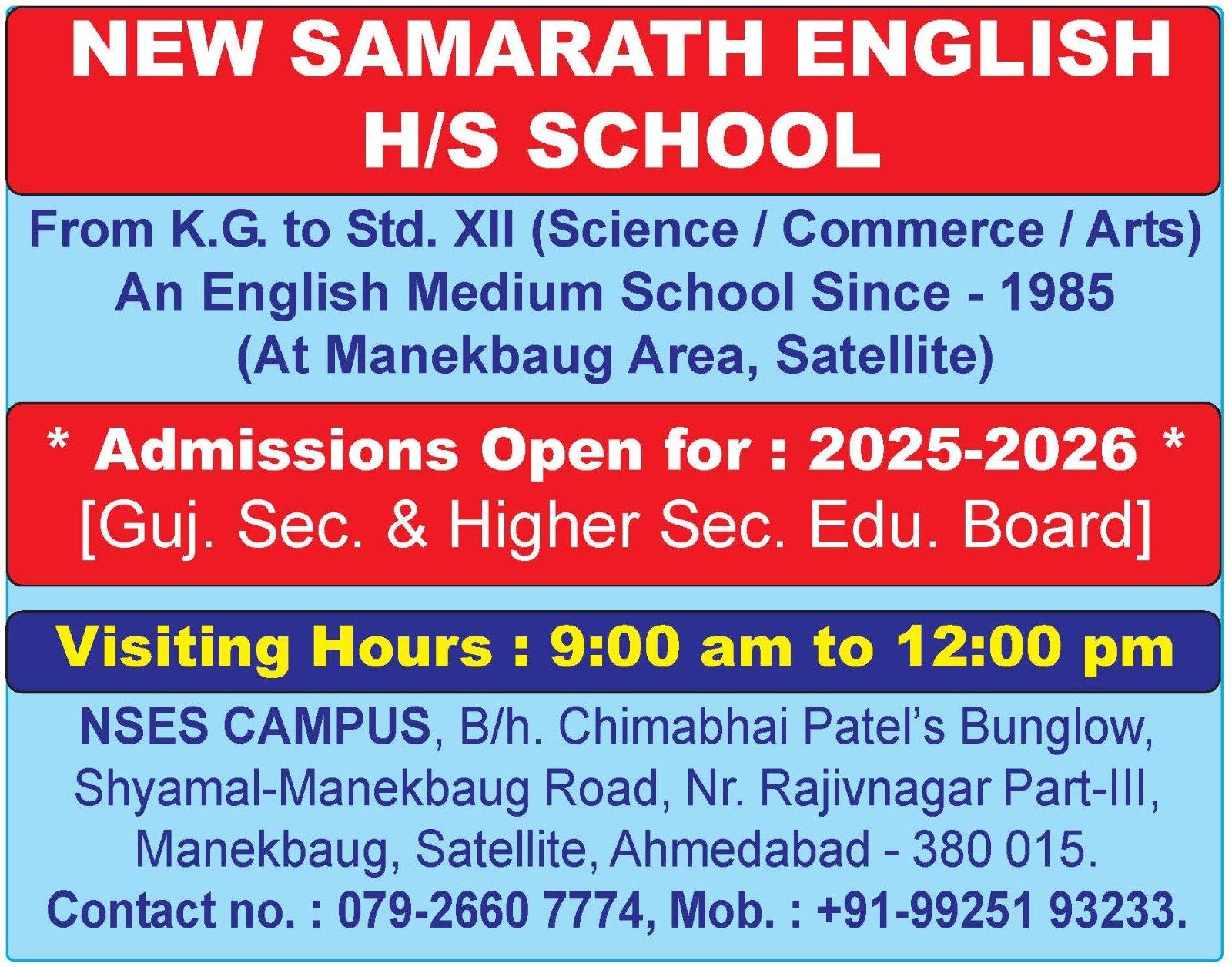 New Samarath English H/S School got established on 5th August 1980. Smt. Tanna Mahadevia and Shantaben Mahadevia have established this Educational Institution in a view to strengthen English Education under Gujarat State Education Board. We have the classes ranging from K.G. till 12th Std. We offer Science, Commerce and Arts Streams for Std. 11th, 12th.